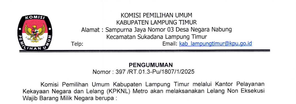 Komisi Pemilihan Umum Kabupaten Lampung Timur melalui Kantor Pelayanan Kekayaan Negara dan Lelang (KPKNL) Metro akan melakukan Lelang Non Eksekusi Wajib Barang Milik Negara berupa: