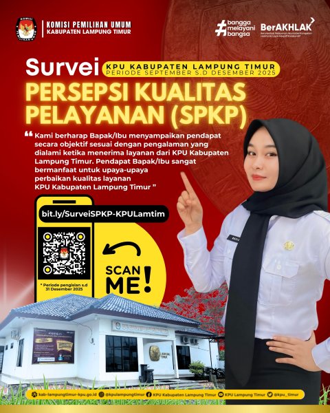 Sebagai wujud dari komitmen tersebut, KPU Kabupaten Lampung Timur mengundang seluruh pengguna layanan dan masyarakat untuk berpartisipasi dalam Survei Persepsi Kualitas Pelayanan (SPKP) Periode September s.d Desember Tahun 2025.
