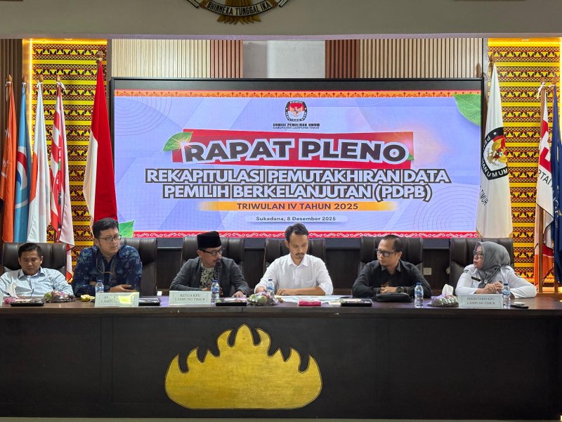 Sukadana - Komisi Pemilihan Umum (KPU) Kabupaten Lampung Timur melaksanakan Rapat Pleno Rekapitulasi Pemutakhiran Data Pemilih Berkelanjutan (PDPB) Triwulan IV Tahun 2025 yang digelar di Aula Kantor KPU Kabupaten Lampung Timur, Senin (8/12).