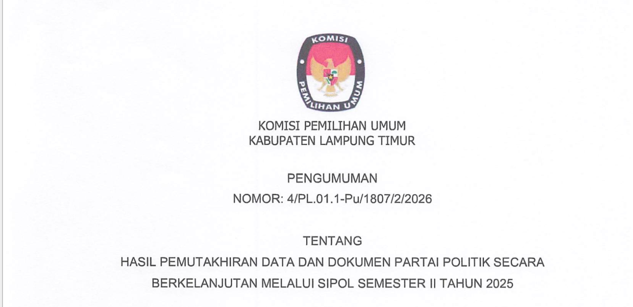 Pengumuman tentang Hasil Pemutakhiran Data dan Dokumen Partai Politik Secara Berkelanjutan Melalui SIPOL Semester II Tahun 2025 Senin, 05 Januari 2026 13:49 93 PENGUMUMAN SELENGKAPNYA DISINI Bagikan: Dilihat 93 Kali.