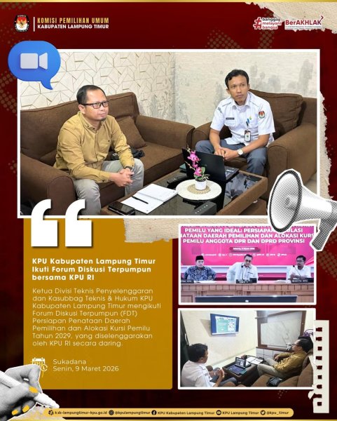 Sukadana - KPU Kabupaten Lampung Timur mengikuti kegiatan Forum Diskusi Terpumpun (FDT) yang diselenggarakan oleh Komisi Pemilihan Umum Republik Indonesia (KPU RI) secara daring melalui Zoom Meeting pada Senin (9/3/2026).