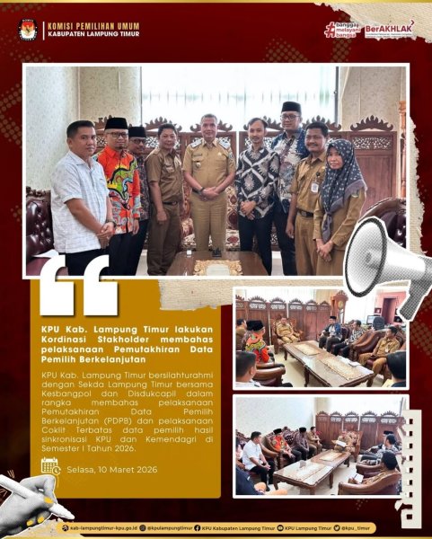 Dalam koordinasi tersebut, KPU Kabupaten Lampung Timur menekankan pentingnya sinergi dan dukungan dari pemerintah daerah serta instansi terkait guna memastikan data pemilih yang akurat, mutakhir, dan berkualitas. Data pemilih yang valid menjadi salah satu faktor penting dalam mendukung terselenggaranya proses demokrasi yang transparan dan akuntabel.