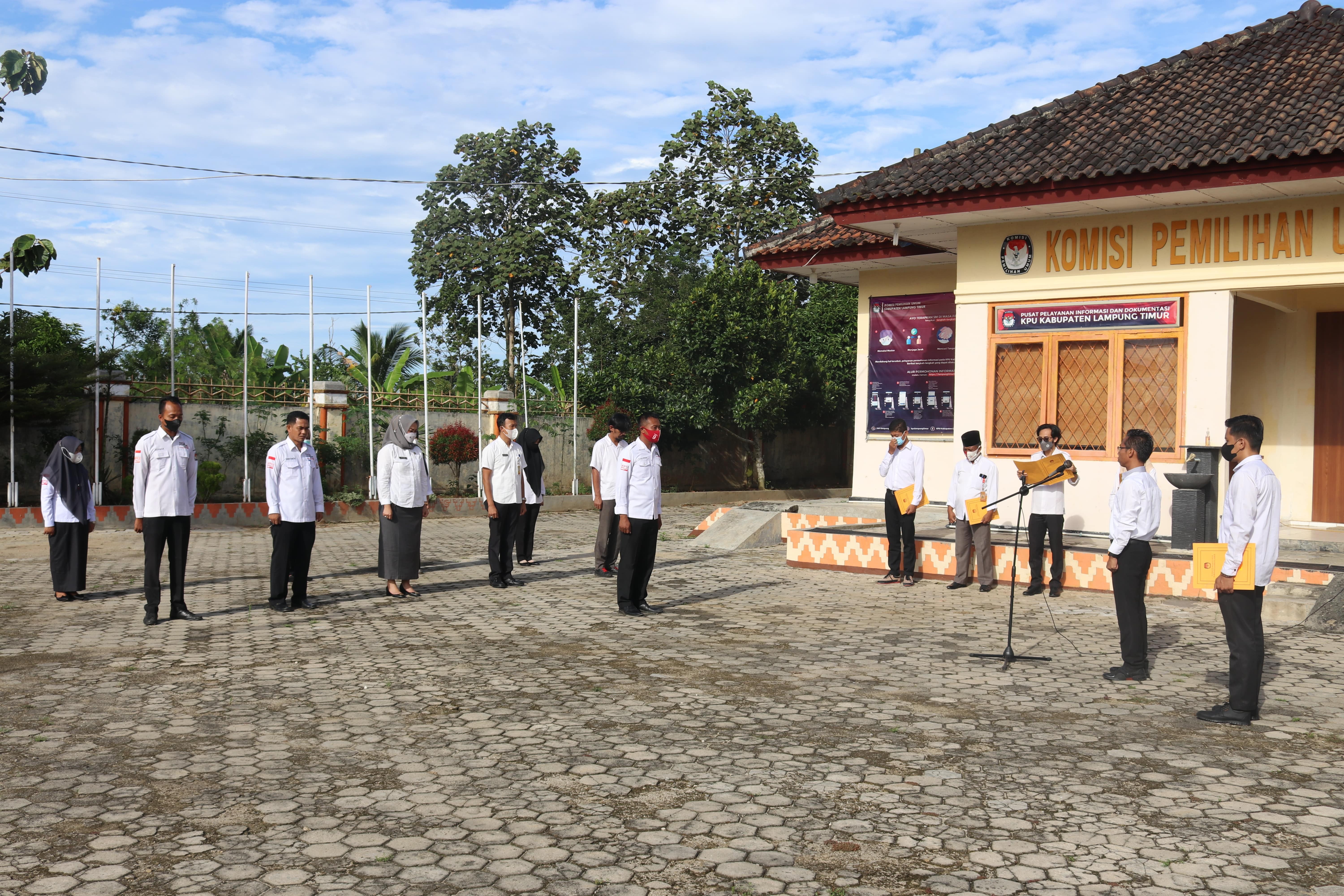 Sukadana, kab-lampungtimur.kpu.go.id - KPU Kabupaten Lampung Timur melaksanakan apel mingguan pada hari Senin, 9 Mei 2022. Apel dilaksanakan dihalaman kantor KPU Kabupaten Lampung Timur. Bertindak sebagai Pembina Apel yaitu Ketua KPU Kabupaten Lampung Timur dan diikuti oleh Sekretaris, Kasubbag serta Staf KPU Kabupaten Lampung Timur. Dalam amanatnya Ketua KPU Kabupaten Lampung Timur menyampaikan dengan kembalinya rutinitas dikantor KPU Kabupaten Lampung Timur pasca cuti bersama Hari Raya Idul Fitri 1443 H agar dapat beraktivitas seperti biasanya dengan semangat baru dan melaksanakan tugas dengan baik mengingat Tahapan Pemilu akan segera dilaksanakan.
