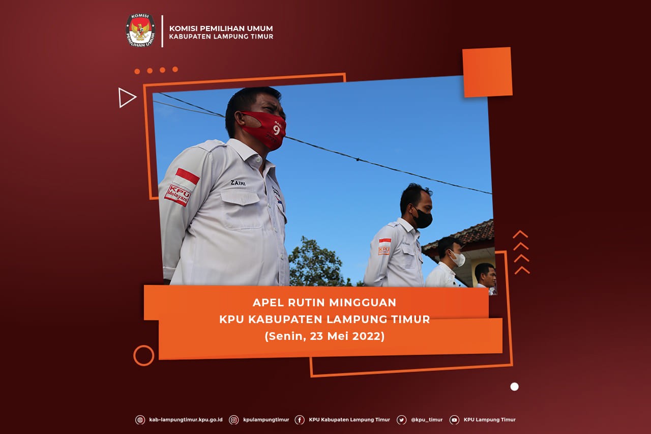 KPU Kabupaten Lampung Timur melaksanakan Apel Rutin Mingguan, Senin (23/05). Kegiatan yang dilaksanakan di Halaman Kantor tersebut diikuti oleh jajaran pegawai sekretariat. Bertindak sebagai Pembina apel, Anggota KPU Kabupaten Lampung Timur Ketua Divisi Perencanaan, Data dan Informasi, M. Wahid Setio Budi.