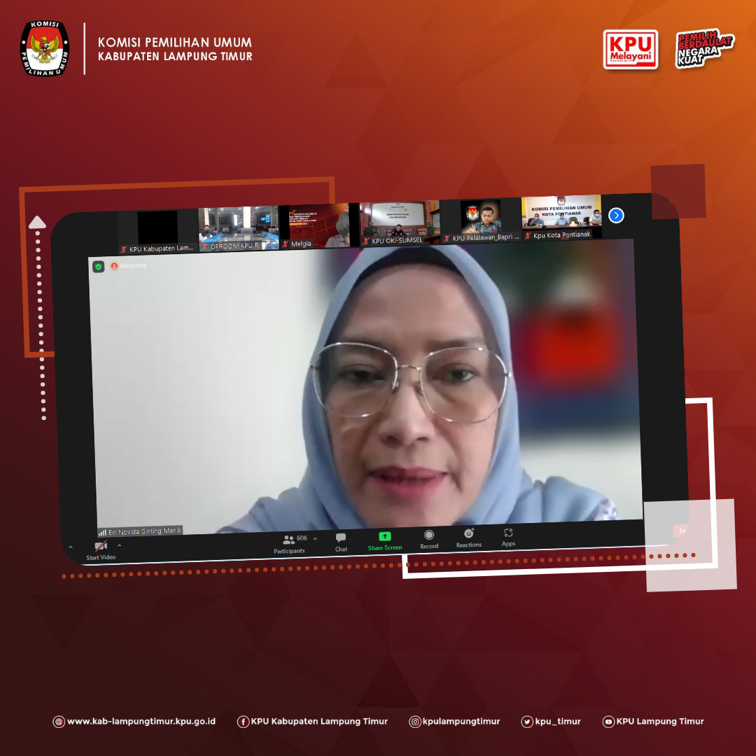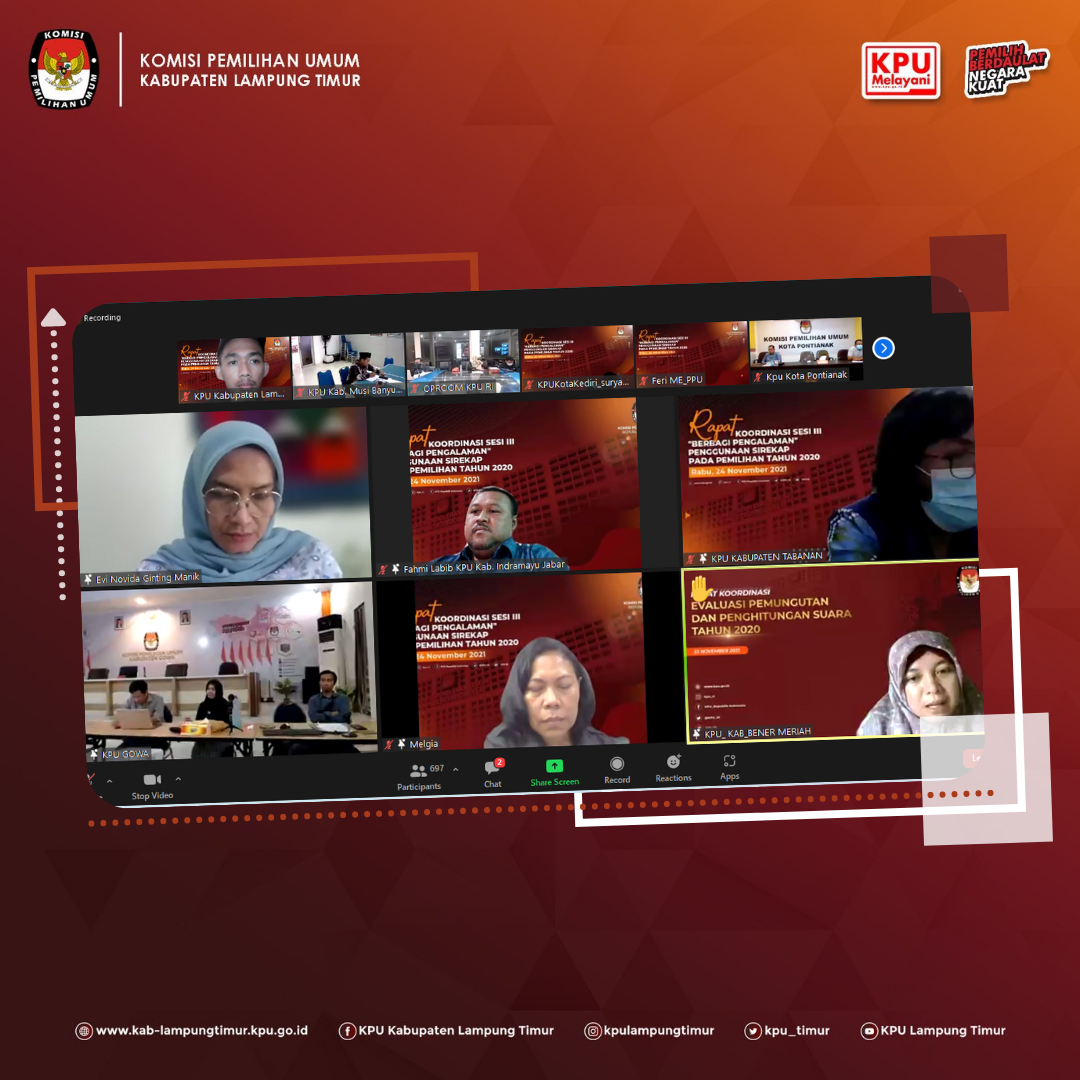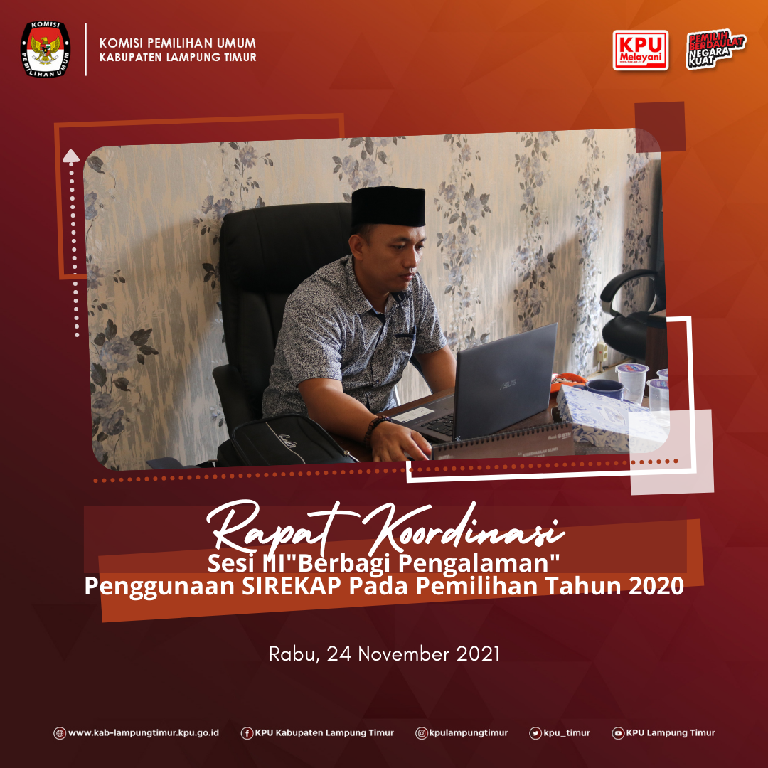 Sukadana, www.kab-lampungtimur.kpu.go.id - Penyelenggaraan tahapan Pemilihan Serentak 2020 telah hampir genap setahun berlalu, akan tetapi dalam penyelenggarannya evaluasi atas pelaksanaan Pemilihan Tahun 2020 terus dilakukan demi perbaikan penyelenggaraan baik itu Pemilu dan Pemilihan selanjutnya. Demikian pula berkenaan dengan penggunaan aplikasi SIREKAP pada Pemilihan Serentak Tahun 2020 yang menjadi isu pada beberapa daerah yang menyelenggarakan pemilihan. Disisi lain terdapat pula daerah-daerah baik itu kabupaten maupun kota yang mendapatkan apresiasi dari Komisi Pemilihan Umum RI atas best practice dalam penggunaan SIREKAP pada Pemilihan Serentak 2020. Hal demikian yang melatarbelakangi diselenggarakannya Rapat Koordinasi Sesi III “Berbagi Pengalaman” Penggunaan Sirekap pada Pemilihan Tahun 2020, Rabu (24/11/2021).