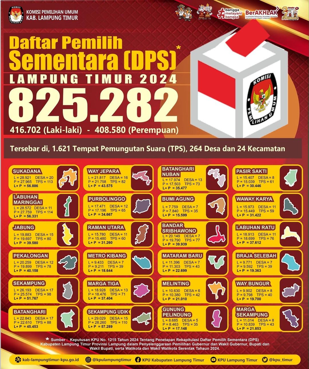 Daftar Pemilih Sementara (DPS) Lampung Timur 2024 berjumlah 825.282.