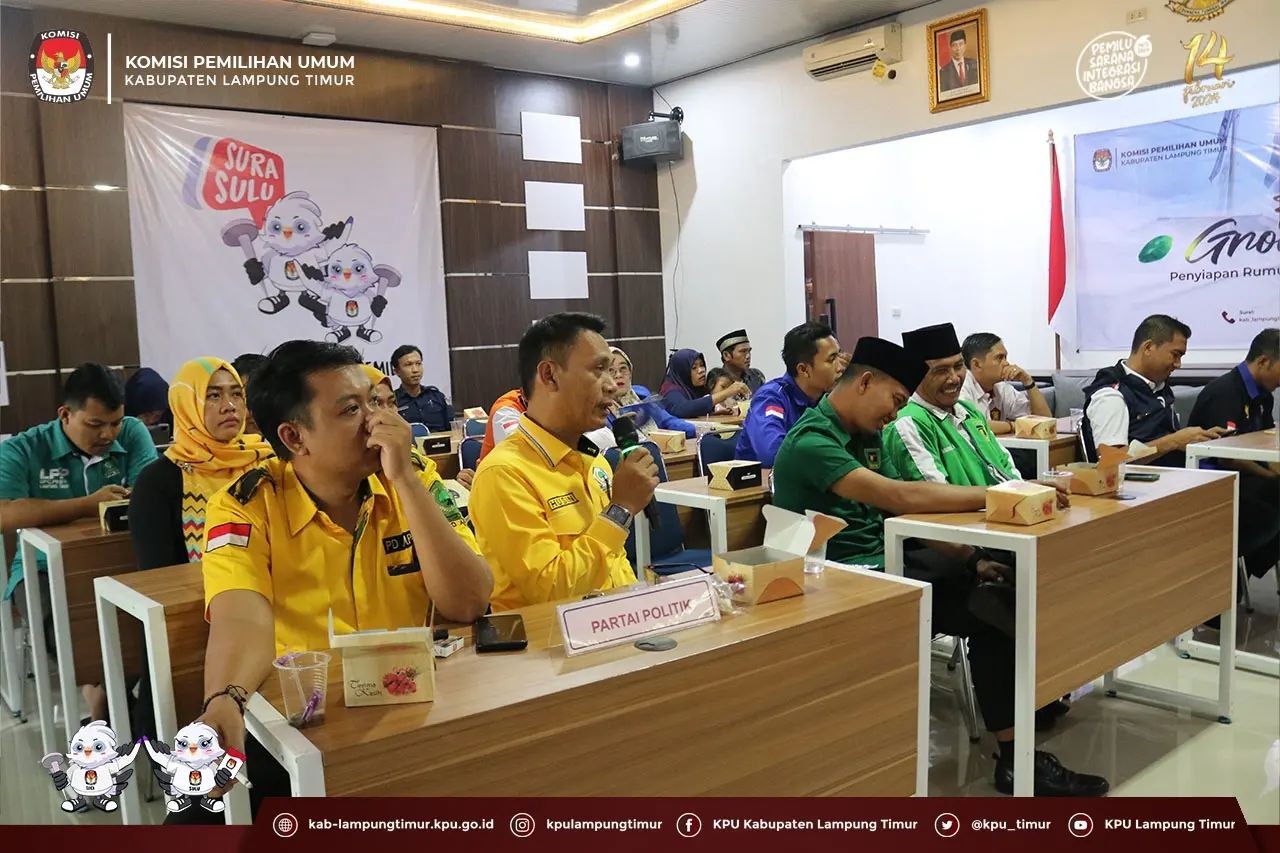 Giat diikuti oleh Ketua dan Anggota KPU Lampung Timur, Sekretaris, Pejabat Struktural. Adapun undangan kegiatan tersebut meliputi Partai Politik peserta Pemilu 2024 dan Bawaslu Lampung Timur.
