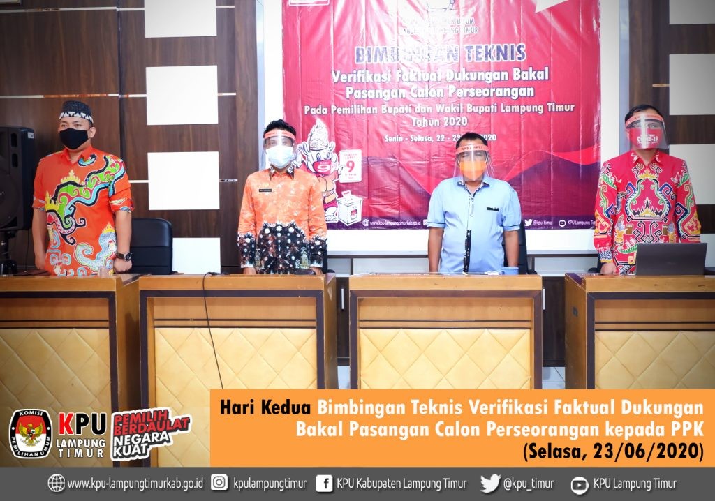 LAMPUNG TIMUR- (Selasa, 23 Juni 2020) Di hari kedua pelaksanaan Bimbingan Teknis terkait Verifikasi Faktual Dukungan Bakal Pasangan Calon Perseorangan pada Pemilihan Bupati dan Wakil Bupati Lampung Timur Tahun 2020 pada hari Selasa 23 Juni 2020. KPU Kabupaten Lampung Timur melaksanakan Bimtek tersebut dengan sukses dan lancar.