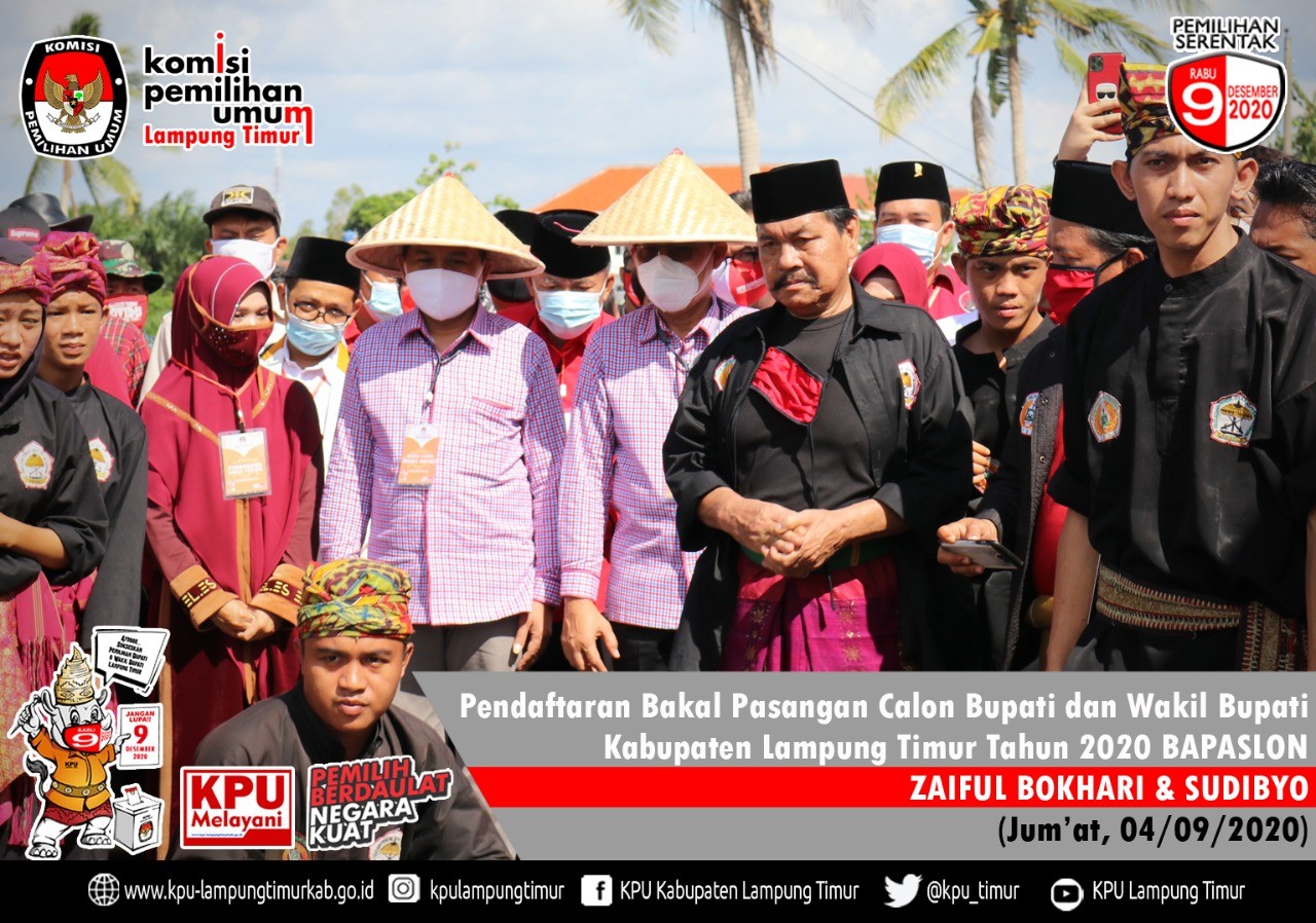 Penerimaan Pendaftaran Bakal Pasangan Calon Bupati dan Wakil Bupati Lampung Timur akan berlangsung dari tanggal 04 – 06 September 2020. Hari pertama dibukanya Pendaftaran KPU Lampung Timur sudah menerima 1 (satu) Bakal Pasangan Calon Bupati dan Wakil Bupati yang menyerahkan dokumen pendaftaran a.n ZAIFUL BOKHARI dan SUDIBYO.