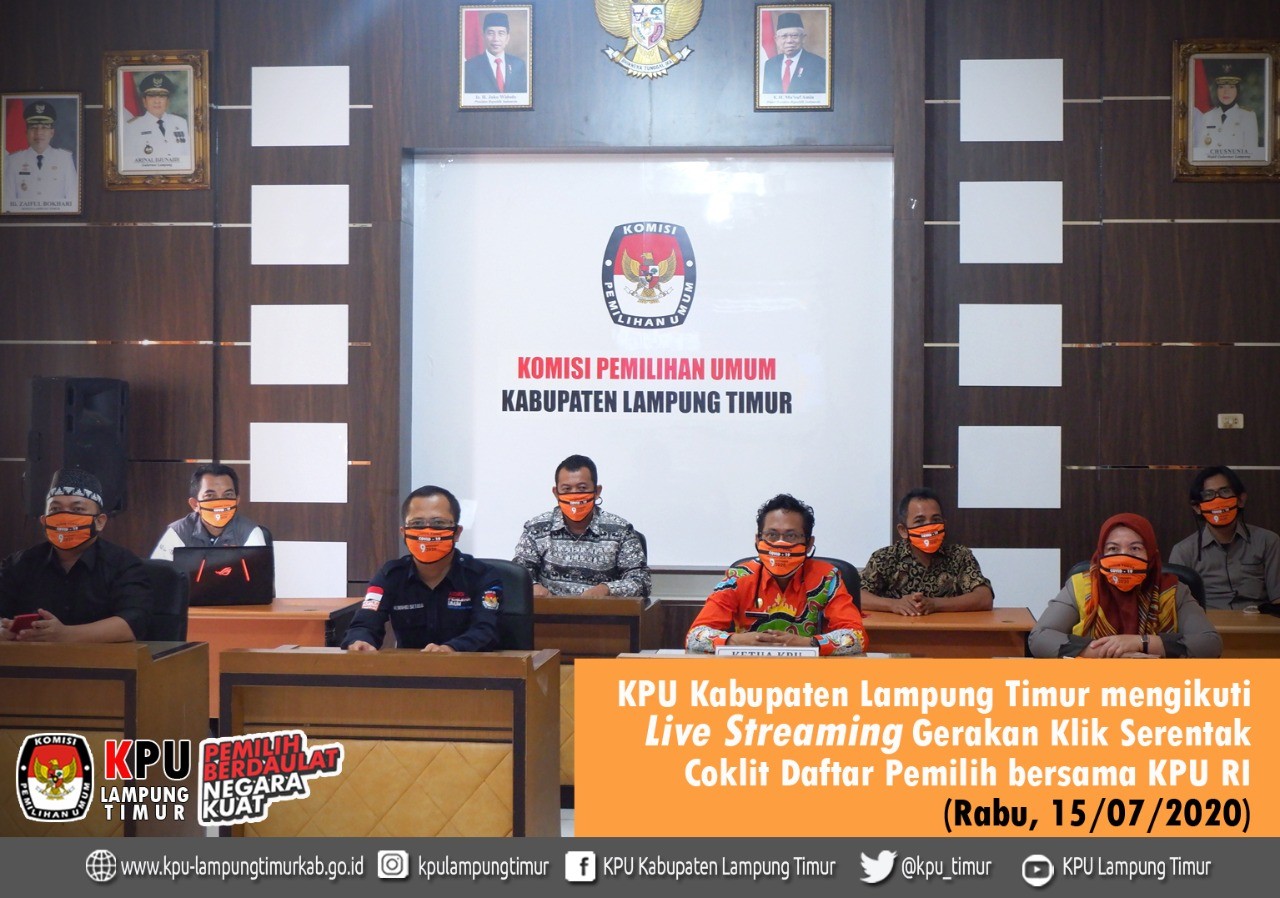 LAMPUNG TIMUR – KPU Kabupaten Lampung Timur mengikuti kegiatan Gerakan Klik Serentak (GKS) Data Pemilih yang di gelar KPU Republik Indonesia secara Live Streaming di akun Facebook KPU Republik Indonesia dari Ruang Rapat Utama Lt 2 KPU RI. Kegiatan ini untuk mengawali pelaksanaan pencocokan dan penelitian (Coklit) data pemilih untuk Pemilihan Gubernur dan wakil Gubernur, Bupati dan Wakil Bupati, Wali Kota dan Wakil Wali Kota pada 09 Desember 2020 mendatang.
