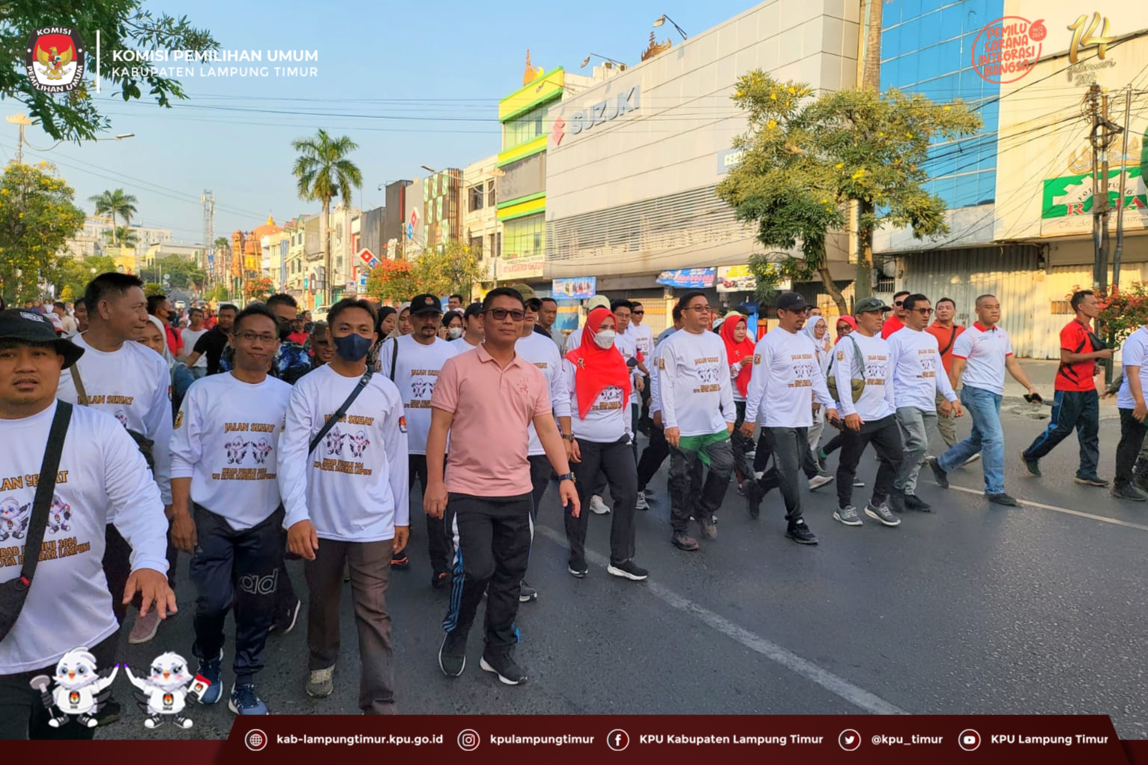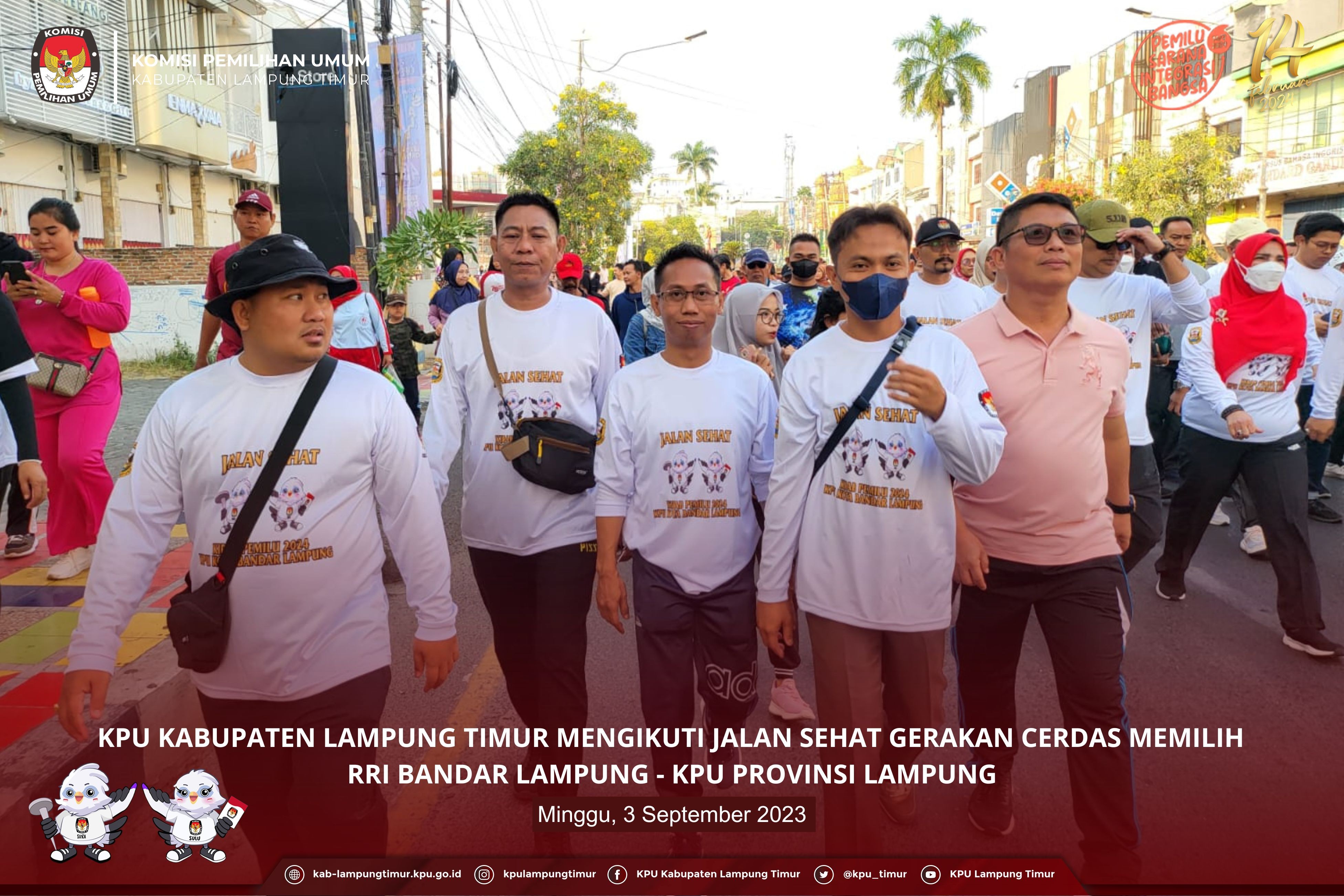 Bandar Lampung, https://kab-lampungtimur.kpu.go.id - #TemanPemilih, Komisi Pemilihan Umum Kabupaten Lampung Timur mengikuti Kegiatan Jalan Sehat Kirab Pemilu 2024 KPU Kota Bandar Lampung dan Jalan Sehat Gerakan Cerdas Memilih dan Dialog Interaktif Menuju Pemilih Cerdas "Pemilih Pemula dan Pemilih Muda Tentukan Nasib Bangsa" yang diadakan oleh KPU Provinsi Lampung dan RRI Bandar Lampung, Minggu(03/09).