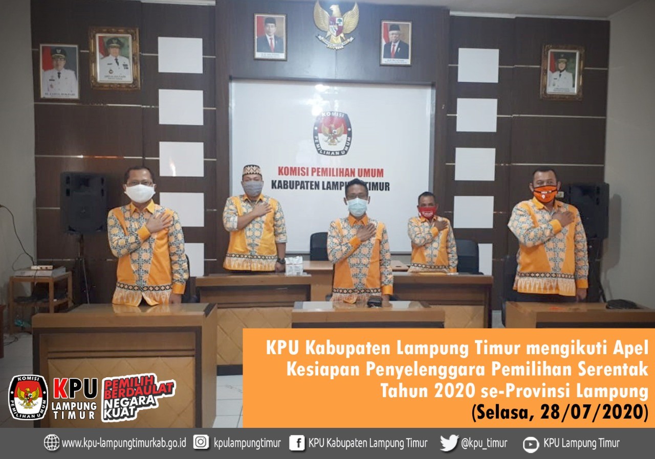 LAMPUNG TIMUR – KPU Kabupaten Lampung Timur beserta PPK se-Kabupaten Lampung Timur (24 Kecamatan) dan PPS se-Kabupaten Lampung Timur yang tersebar di 61 titik akses ikuti Apel Kesiapan Penyelenggaraan Pemilihan Serentak Tahun 2020 di Provinsi Lampung secara Daring dari Aula Nuwa Demokrasi, Selasa (28/7/2020).