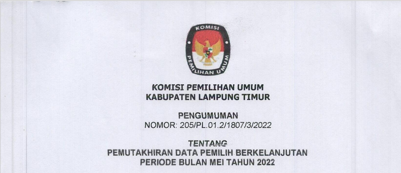 Pemutakhiran Data Pemilih Berkelanjutan Periode Bulan Mei Tahun 2022 Selasa, 31 Mei 2022 00:00 71 selengkapnya disini Bagikan: Dilihat 71 Kali.