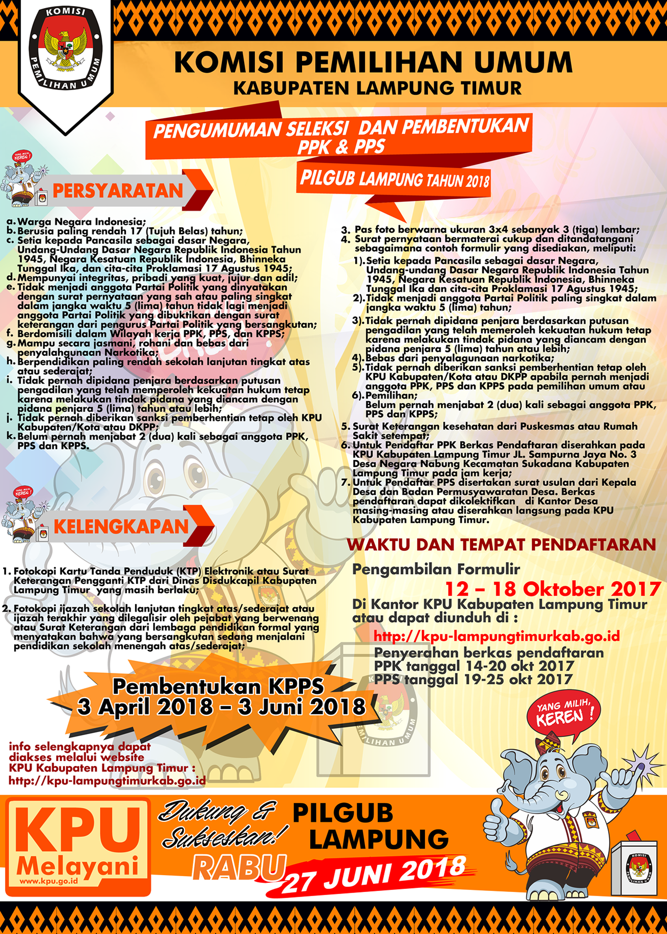 Dalam rangka Pemilihan Gubernur dan Wakil Gubernur Provinsi Lampung Tahun 2018 Komisi Pemilihan Umum Kabupaten Lampung Timur membuka kesempatan kepada yang memenuhi persyaratan kompetensi dan administrasi untuk mendaftar sebagai calon Anggota Panitia Pemilihan Kecamatan (PPK), Panitia Pemungutan Suara (PPS) dan Kelompok Penyelenggara Pemungutan Suara (KPPS) Pada Pemilihan Gubernur dan Wakil Gubernur Provinsi Lampung Tahun 2018 dapat dilihat DISINI