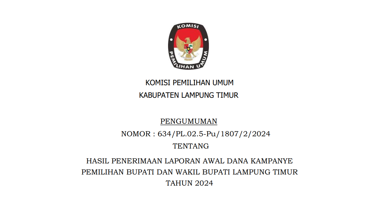 PENGUMUMAN HASIL PENERIMAAN LAPORAN AWAL DANA KAMPANYE PEMILIHAN BUPATI DAN WAKIL BUPATI LAMPUNG TIMUR TAHUN 2024 Sabtu, 28 September 2024 07:00 354 Pengumuman selengkapnya > Disini Bagikan: Dilihat 354 Kali.