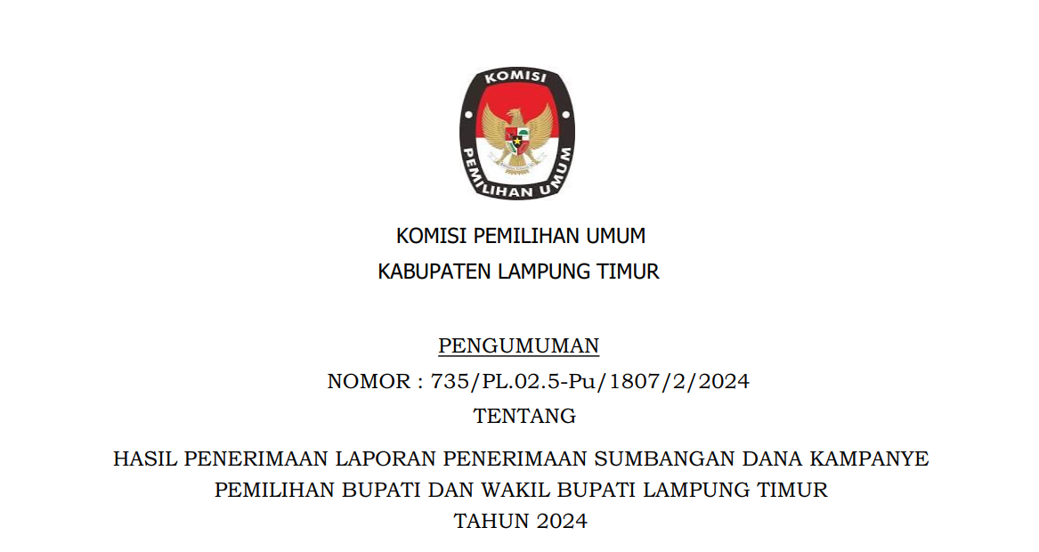 PENGUMUMAN HASIL PENERIMAAN LAPORAN PENERIMAAN SUMBANGAN DANA KAMPANYE PEMILIHAN BUPATI DAN WAKIL BUPATI LAMPUNG TIMUR TAHUN 2024 Sabtu, 26 Oktober 2024 07:00 121 Pengumuman selengkapnya DISINI Bagikan: Dilihat 121 Kali.