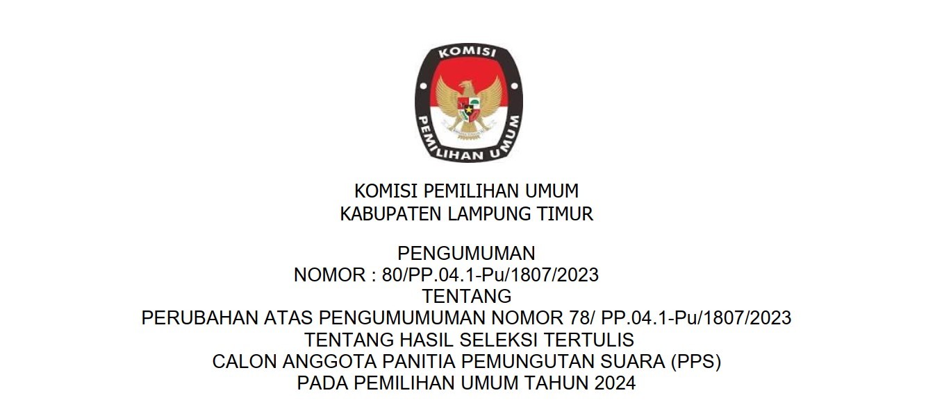 PENGUMUMAN NOMOR : 80/PP.04.1-Pu/1807/2023 TENTANG PERUBAHAN ATAS PENGUMUMAN NOMOR 78/ PP.04.1-Pu/1807/2023 TENTANG HASIL SELEKSI TERTULIS CALON ANGGOTA PPS