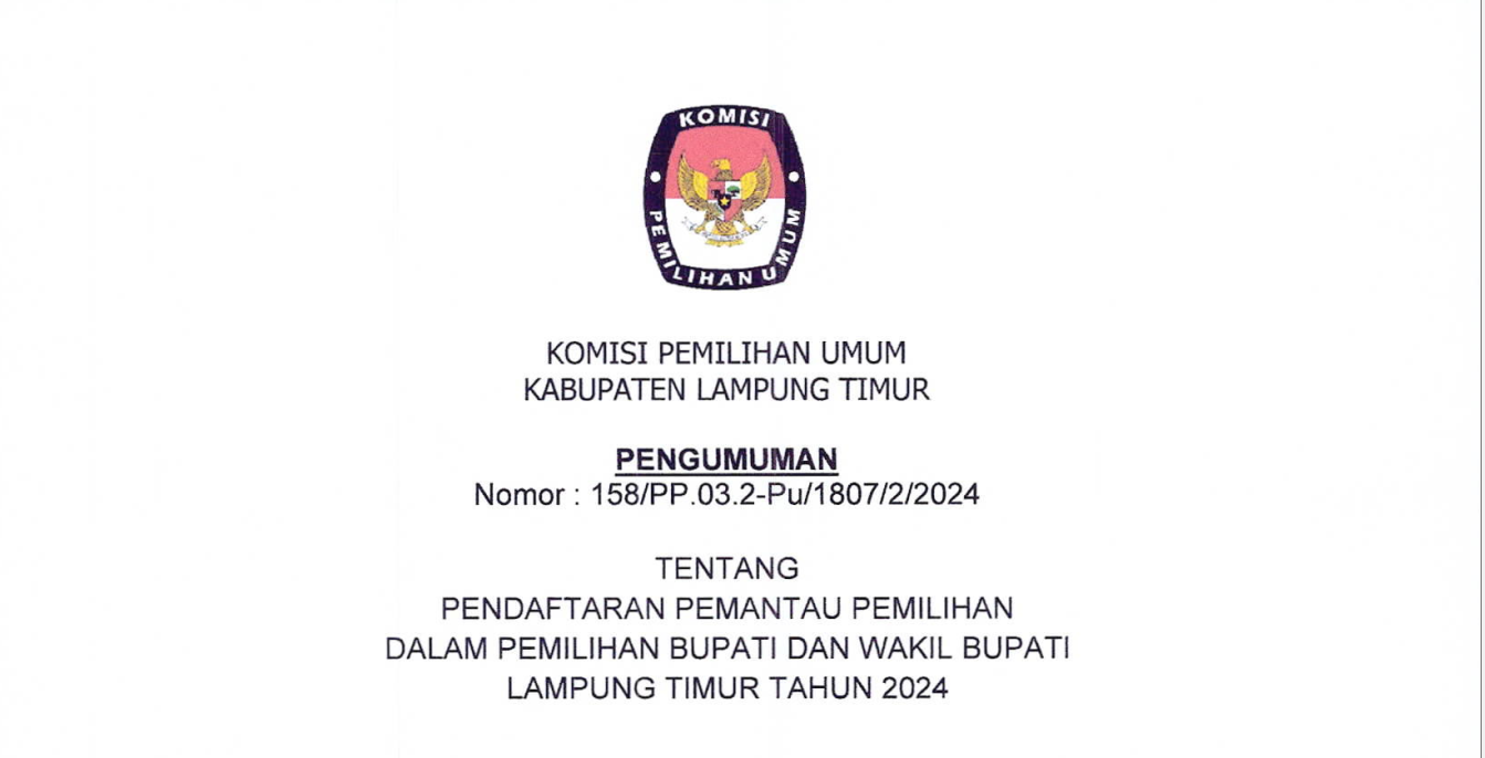 PENGUMUMAN PENDAFTARAN PEMANTAU PEMILIHAN DALAM PEMILIHAN BUPATI DAN WAKIL BUPATI LAMPUNG TIMUR TAHUN 2024 Selasa, 27 Februari 2024 07:00 105 PENGUMUMAN SELENGKAPNYA DISINI LINK DOKUMEN PENDAFTARAN DISINI LINK PENDAFTARAN DISINI Bagikan: Dilihat 105 Kali.
