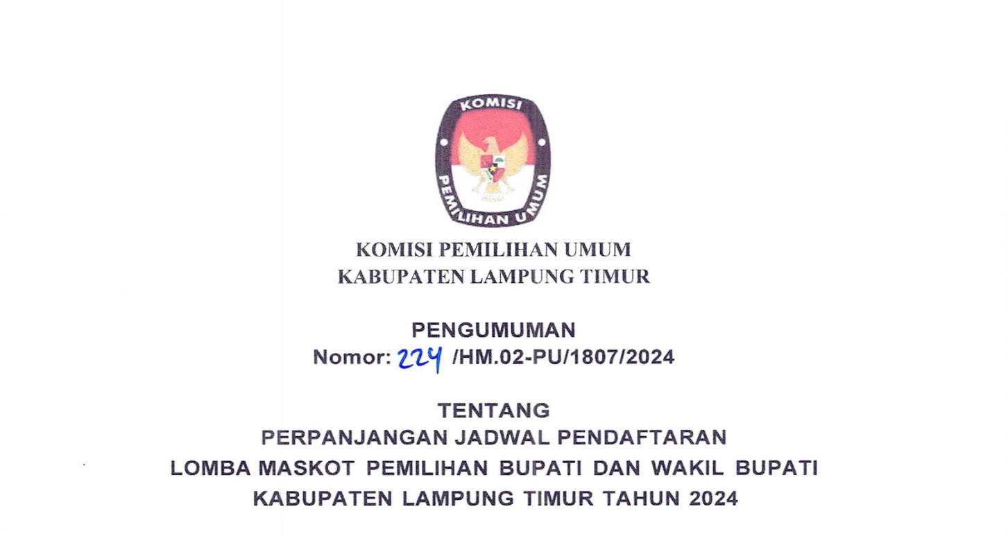 Berdasarkan Pengumuman Nomor 197//HM.02-Pu/1807/2024 tentang Lomba Maskot dan Jingle Pemilihan Bupati dan Wakil Bupati Lampung Timur Tahun 2024, bersama ini kami sampaikan perubahan Penutupan Pendaftaran Lomba Maskot Pemilihan Bupati dan Wakil Bupati Lampung Timur Tahun 2024 yang semula ditutup sampai dengan tanggal 18 April 2024 pukul 16.00 WIB, diperpanjang menjadi tanggal 25 April 2024 pukul 16.00 WIB.