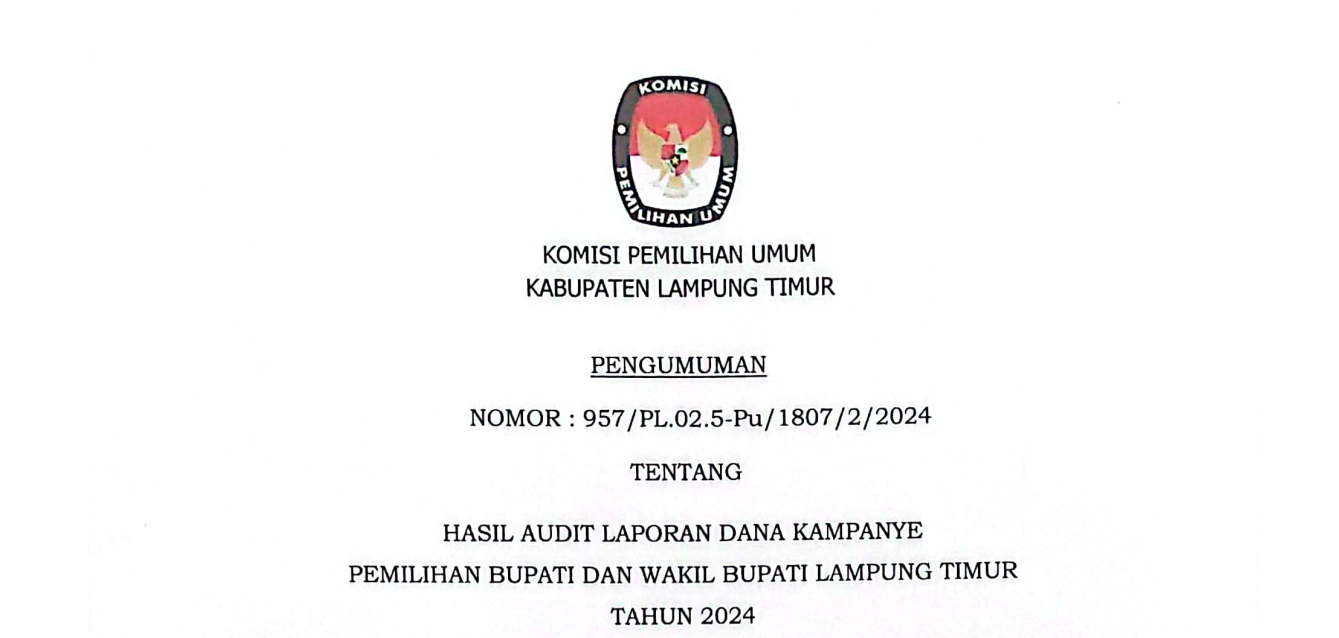 PENGUMUMAN TENTANG HASIL AUDIT LAPORAN DANA KAMPANYE PEMILIHAN BUPATI DAN WAKIL BUPATI LAMPUNG TIMUR TAHUN 2024 Jumat, 13 Desember 2024 13:00 417 PENGUMUMAN SELENGKAPNYA DISINI Bagikan: Dilihat 417 Kali.