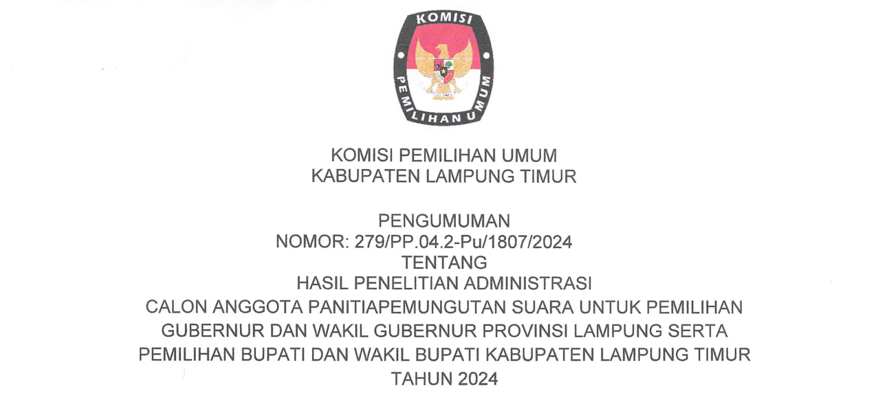 PENGUMUMAN TENTANG HASIL PENELITIAN ADMINISTRASI CALON ANGOTA PPS UNTUK PEMILIHAN GUBENUR DAN WAKIL GUBERNUR LAMPUNG, BUPATI DAN WAKIL BUPATI LAMPUNG TIMUR Senin, 13 Mei 2024 23:56 777 PENGUMUMAN SELENGKAPNYA > DISINI Bagikan: Dilihat 777 Kali.