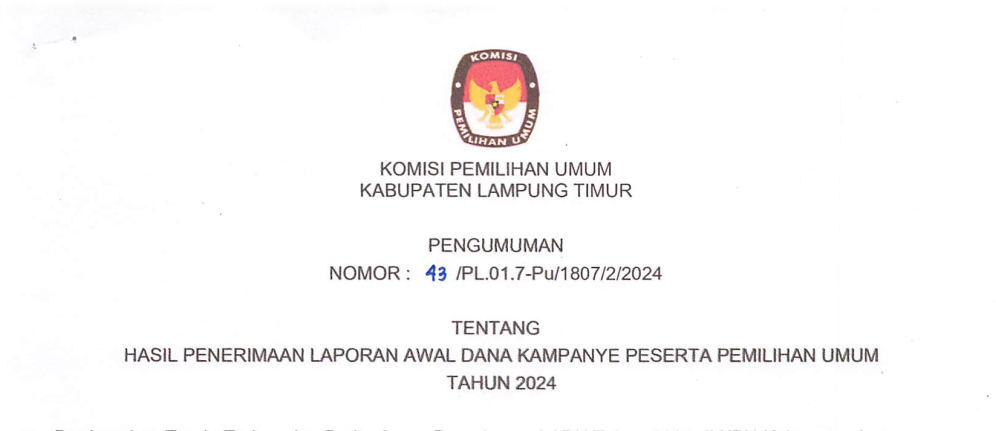 Pengumuman tentang Hasil Penerimaan Laporan Awal Dana Kampanye Peserta Pemilu Tahun 2024