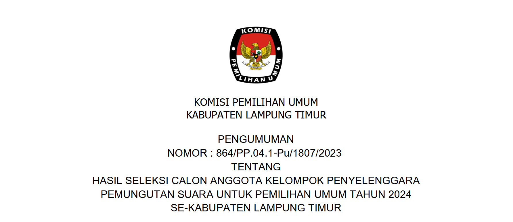PENGUMUMAN TENTANG HASIL SELEKSI CALON ANGGOTA KELOMPOK PENYELENGGARA PEMUNGUTAN SUARA UNTUK PEMILIHAN UMUM TAHUN 2024 SE-KABUPATEN LAMPUNG TIMUR