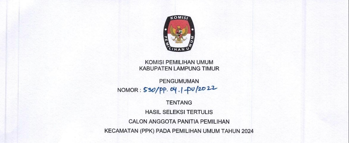PENGUMUMAN TENTANG HASIL SELEKSI TERTULIS CALON ANGGOTA PANITIA PEMILIHAN KECAMATAN (PPK) PADA PEMILU TAHUN 2024 Kamis, 08 Desember 2022 00:00 751 PENGUMUMAN SELENGKAPNYA DAPAT DIAKSES DISINI Bagikan: Dilihat 751 Kali.