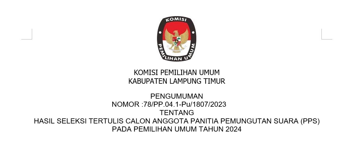 Berdasarkan hasil Rapat Pleno Komisi Pemilihan Umum Kabupaten Lampung Timur Nomor : 05/PL.01.3-BA/1807/4/2023 tanggal 12 Januari 2023 tentang Hasil Tes Tertulis Calon Anggota Panitia Pemungutan Suara (PPS) Pada Pemilihan Umum Tahun 2024.