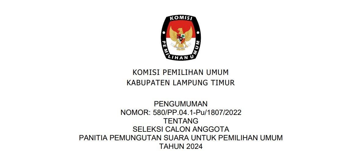 Dalam rangka pembentukan Panitia Pemungutan Suara untuk Pemilihan Umum, Komisi Pemilihan Umum Kabupaten Lampung Timur mengundang Warga Negara Indonesia yang memenuhi persyaratan untuk mendaftarkan diri menjadi anggota Panitia Pemungutan Suara untuk Pemilihan Umum dengan ketentuan sebagai berikut: