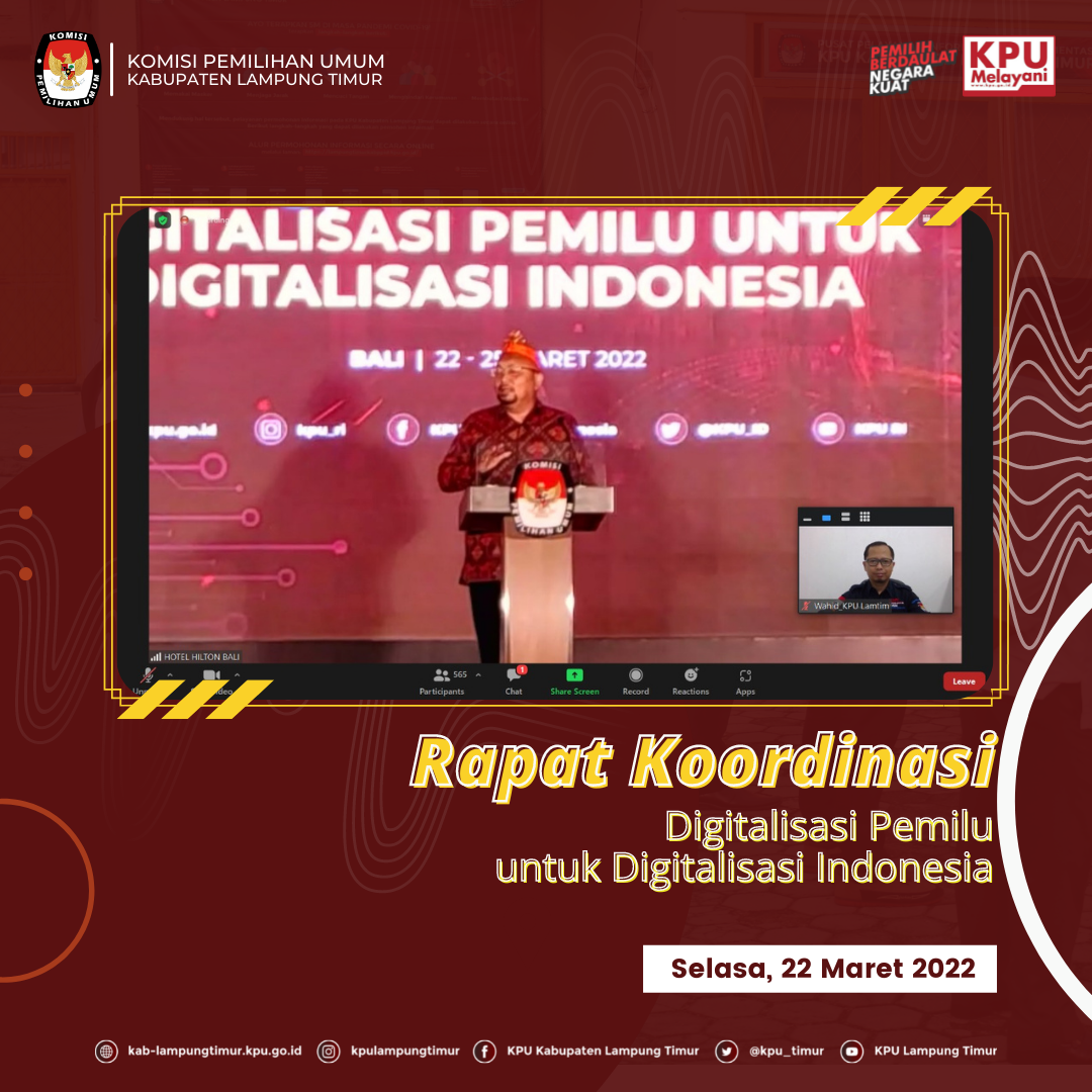 Sukadana, kab-lampungtimur.kpu.go.id - KPU Kabupaten Lampung Timur mengikuti kegiatan Digitalisasi Pemilu untuk Digitalisasi Indonesia secara daring. Acara ini diselenggarakan oleh KPU RI. Kegiatan ini dilaksanakan mulai tanggal 22 Maret 2022 sampai 25 Maret 2022 mulai pukul 19.00 WIB. Hadir dalam acara ini Ketua Divisi Perencanaan, Data dan Informasi KPU Kabupaten Lampung Timur, M. Wahid Setio Budi.