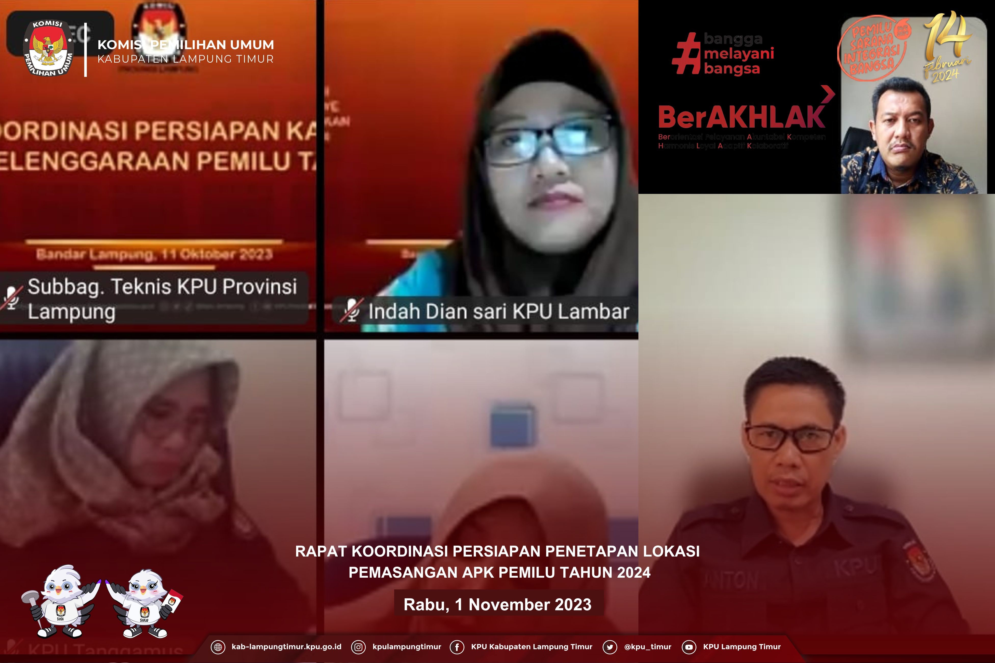 Sukadana, kab-lampungtimur.kpu.go.id - Anggota KPU Kabupaten Lampung Timur Divisi Sosdiklih, Parmas dan SDM F. Bagus Kumbara mengikuti kegiatan Rapat Koordinasi Persiapan Penetapan Lokasi Pemasangan Alat Peraga Kampanye (APK) Pemilu Tahun 2024 melalui Zoom Meeting di Kantor KPU Kabupaten Lampung Timur yang diselenggarakan oleh KPU Provinsi Lampung dan diikuti oleh KPU Kabupaten/Kota se-Provinsi Lampung, Rabu (01/11).