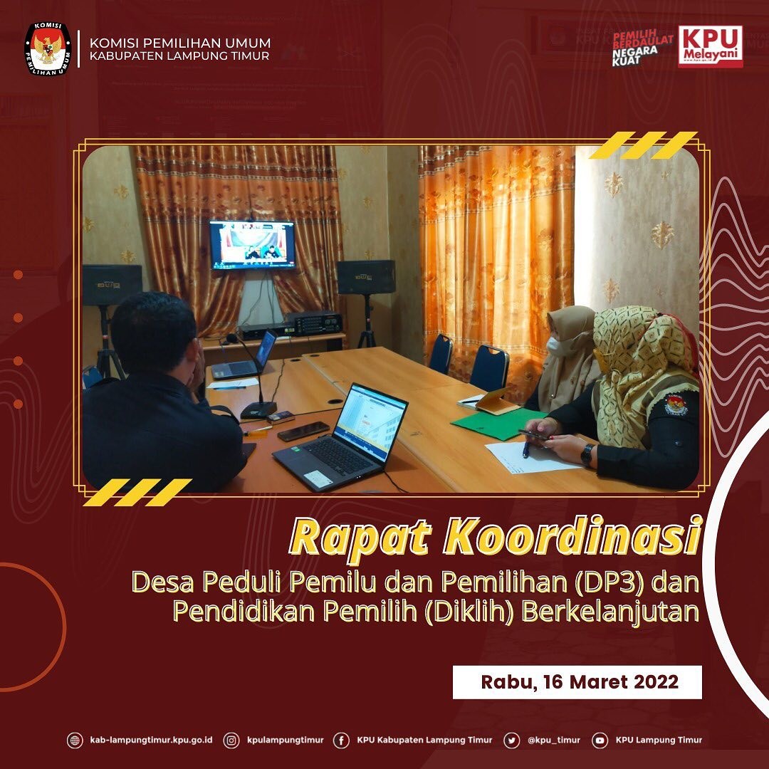 Sukadana, kab-lampungtimur.kpu.go.id - #TemanPemilih, KPU Kabupaten Lampung Timur hari ini mengikuti Rapat Koordinasi Desa Peduli Pemilu dan Pemilihan (DP3) dan Pendidikan Pemilih (Diklih) Berkelanjutan secara daring (Rabu, 16 Maret 2022). Rapat diselenggarakan oleh KPU Propinsi Lampung. Acara ini dipimpin langsung oleh Ketua Divisi Sosdiklih Parmas KPU Provinsi Lampung, Antoniyus Cahyalana. Hadir dalam kegiatan ini Ketua Divisi Sosdiklih Parmas KPU Kabupaten Lampung Timur, F. Bagus Kumbara, Sekretaris KPU Kabupaten Lampung Timur, Wynda Titra Agustina dan Staf KPU Kabupaten Lampung Timur. Kegiatan tersebut juga diikuti oleh Ketua Divisi Sosdiklih Parmas serta Kasubbag Teknis Pemilu dan Humas KPU Kab/Kota Se Provinsi Lampung.