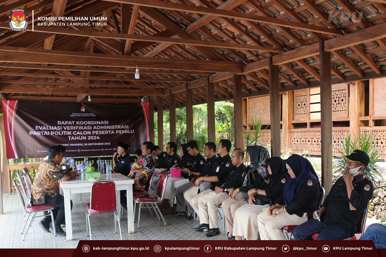 Sukadana, kab-lampungtimur.kpu.go.id – Tahapan verifikasi administrasi dokumen persyaratan keanggotaan Partai Politik oleh KPU Kabupaten/Kota telah rampung dilaksanakan pada 10 September 2022, termasuk yang dilakukan oleh KPU Kabupaten Lampung Timur. Berlandaskan atas hal tersebut, serta dalam rangka menuju persiapan pelaksanaan Verifikasi Administrasi Perbaikan, KPU Kabupaten Lampung Timur melaksanakan Rapat Koordinasi Evaluasi Verifikasi Administrasi Partai Politik Calon Peserta Pemilu 2022, Rabu (28/09).