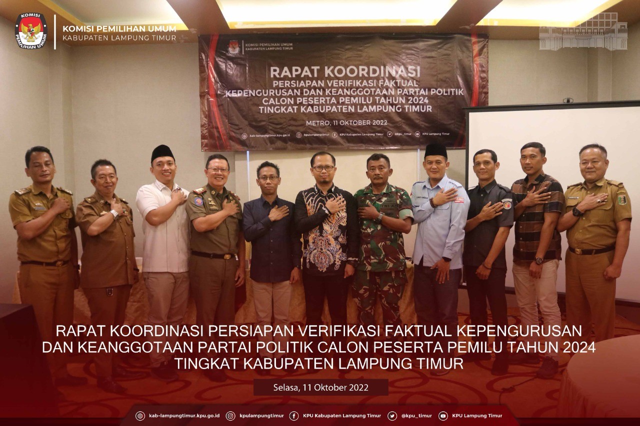 Rapat koordinasi dipandu langsung oleh Anggota KPU Kabupaten Lampung Timur Divisi Teknis Penyelenggara Pemilu, Desman Yusri. Pembahasan rapat ini yaitu terkait Peraturan KPU No 4 Tahun 2022 yaitu terkait Pelaksanaan Verifikasi Faktual Kepengurusan dan Keanggotaan Partai Politik Calon Peserta Pemilu 2024 Tingkat Kabupaten Lampung Timur. Tim Verifikator akan melaksanakan Verifikasi Faktual pada tanggal 15 Oktober s.d 4 November 2022 (21 hari). Selain itu, rakor bersama stakeholder ini bertujuan untuk memberikan informasi kepada masyarakat khususnya di wilayah Kabupaten Lampung Timur terkait verifikasi faktual yang akan dilaksanakan oleh KPU Kabupaten Lampung Timur.