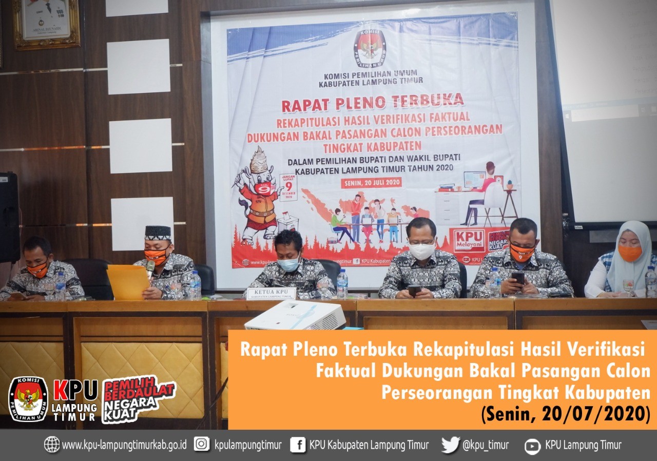 LAMPUNG TIMUR - Rapat Pleno Terbuka Rekapitulasi Hasil Verifikasi Faktual Dukungan Bakal Pasangan Calon Perseorangan di Tingkat Kabupaten yang berlangsung di Gedung KPU Kabupaten Lampung Timur (Senin, 20/07/2020) merupakan Rekapitulasi Hasil Verifikasi Faktual Dukungan Bakal Pasangan Calon Perseorangan oleh Panitia Pemilihan Kecamatan (PPK) se- Kabupaten Lampung Timur dalam rangka Pemilihan Bupati dan Wakil Bupati Lampung Timur Tahun 2020.