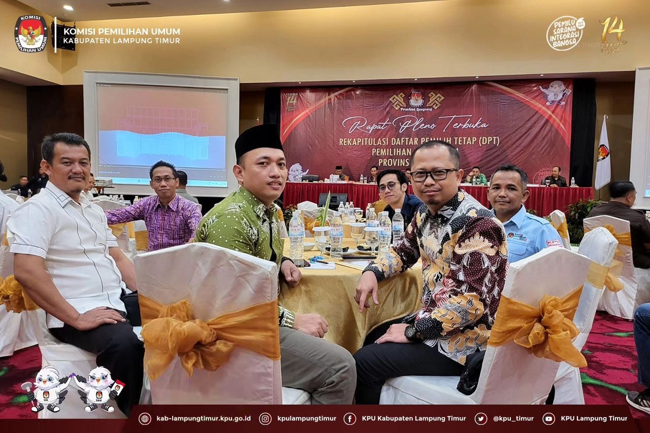 Sukadana, kab-lampungtimur.kpu.go.id – KPU Kabupaten Lampung Timur turut dalam pelaksanaan Rapat Pleno Terbuka Rekapitulasi Penetapan Daftar Pemilih Tetap (DPT) Pemilu 2024 Provinsi Lampung yang dilaksanakan di Emersia Hotel Bandar Lampung, Selasa (27/06). Diikuti oleh Ketua, Anggota, Sekretaris, Kepala Sub Bagian Perencanaan, Data dan Informasi serta Admin/Operator Sidalih, forum yang dimulai pukul 10.00 WIB tersebut secara resmi menetapkan jumlah Daftar Pemilih Tetap (DPT) pada Provinsi Lampung berjumlah 6.539.128 pemilih. Jumlah tersebut merupakan 3.326.334 pemilih laki-laki dan 3.212.794 pemilih perempuan yang tersebar di 229 Kecamatan, 2.651 Desa/Kelurahan, serta 25.825 TPS. Pada kesempatan tersebut, Ketua Divisi Rendatin KPU Lampung Timur, M. Wahid Setio Budi menyampaikan rekapitulasi DPT yang telah ditetapkan di Lampung Timur sebelumnya.