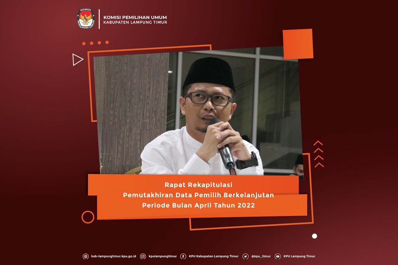 Metro, kab-lampungtimur.kpu.go.id - KPU Kabupaten Lampung Timur pada hari Rabu, 27 April 2022 melaksanakan Rapat Rekapitulasi Pemutakhiran Data Pemilih Berkelanjutan Periode Bulan April Tahun 2022. Rapat dilaksanakan di Pawon Mas, Kota Metro. Rapat ini dihadiri oleh Ketua KPU Kabupaten Lampung Timur (Wasiyat Jarwo Asmoro), Anggota KPU Kabupaten Lampung Timur (Wanahari, F. Bagus Kumbara, M. Wahid Setio Budi, Desman Yusri), Sekretaris (Wynda Titra Agustina), Kasubbag Keuangan, Umum dan Logistik (Budiyanto), Kasubbag Hukum dan SDM (Febra Oka Mahendra), Kasubbag Teknis Penyelenggaraan Pemilu dan Hupmas (Resdianto) dan Kasubbag Perencanaan, Data dan Informasi (Zaina Purnama Sari). Selain itu, rapat ini juga diikuti oleh seluruh pegawai dijajaran Sekretariat KPU Kabupaten Lampung Timur. Hasil Rapat Rekapitulasi Pemutakhiran Data Pemilih Berkelanjutan Periode Bulan April Tahun 2022 diantaranya yaitu : Jumlah Data Pemilih Bulan Berjalan sebanyak 769.370 (tujuh ratus enam puluh sembilan ribu tiga ratus tujuh puluh) Pemilih, yang tersebar di 2020 (dua ribu dua puluh) TPS, 264 (dua ratus enam puluh empat) Desa dan 24 (dua puluh empat) Kecamatan.