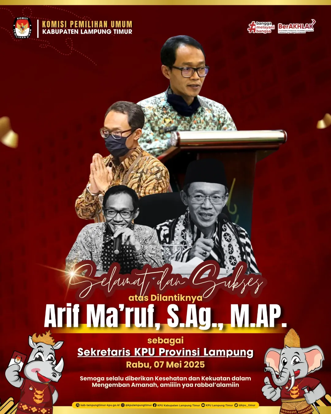 Bandar Lampung - Komsisi Pemilihan Umum (KPU) Kabupaten Lampung mengucapkan selamat atas dilantiknya Arif Ma'ruf sebagai Sekretaris KPU Provinsi Lampung, Rabu siang, (7/5).