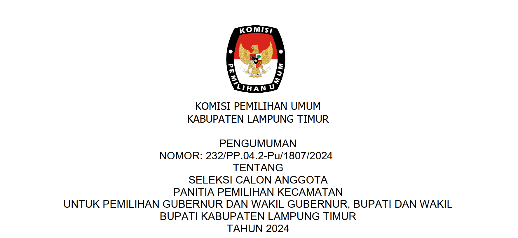 Dalam rangka pembentukan Calon Anggota Panitia Pemilihan Kecamatan untuk Pemilihan Gubernur dan Wakil Gubernur, Bupati dan Wakil Bupati, dan Wali Kota dan Wakil Wali Kota Tahun 2024, Komisi Pemilihan Umum Kabupaten Lampung Timur mengundang Warga Negara Indonesia yang memenuhi kualifikasi untuk mendaftarkan diri menjadi Panitia Pemilihan Kecamatan untuk Pemilihan Gubernur dan Wakil Gubernur, Bupati dan Wakil Bupati, dan Wali Kota dan Wakil Wali Kota dengan ketentuan sebagai berikut: