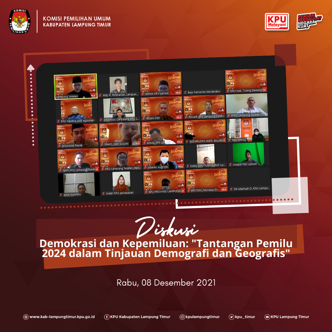 Sukadana, kab.lampungtimur.kpu.go.id - Diskusi Demokrasi dan Kepemiluan hampir menginjak pada ujung seri. Pada kesempatan yang digelar Rabu (08/12), diskusi seri ke-16 dilaksanakan oleh KPU Kabupaten Lampung Selatan. Kegiatan tersebut kembali dilakukan secara tatap maya.
