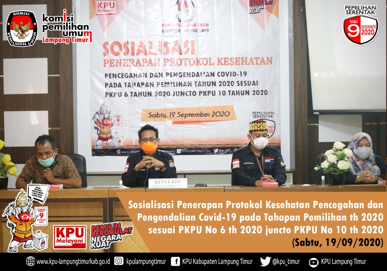 LAMPUNG TIMUR – Komisi Pemilihan Umum Kabupaten Lampung Timur menggelar Sosialisasi PKPU Nomor 6 Tahun 2020 jo PKPU 10 Tahun 2020 tentang pemilihan Gubernur dan Wakil Gubernur, Bupati dan Wakil Bupati, Wali Kota dan Wakil Wali Kota serentak dalam kondisi bencana non alam (COVID-19).