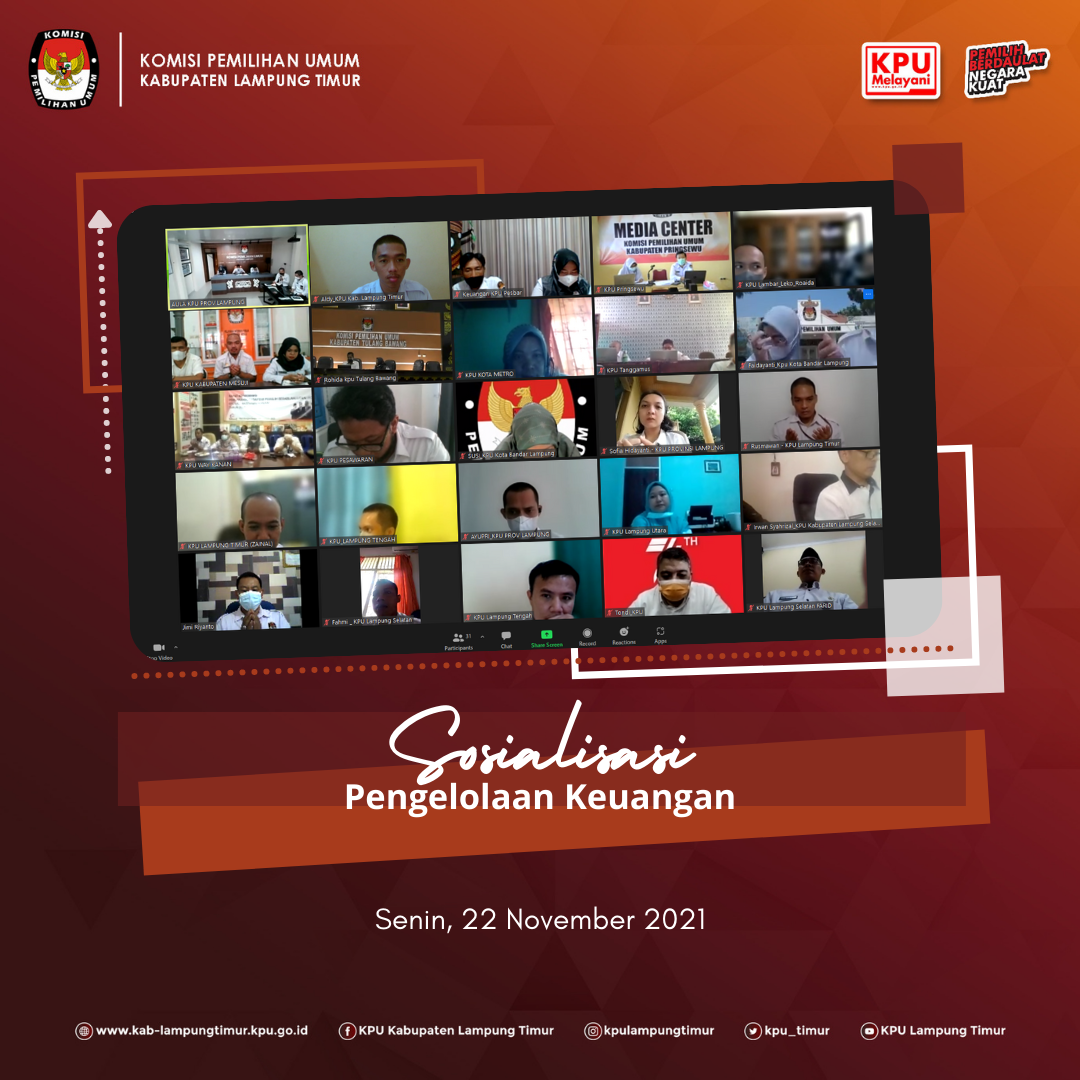 Sukadana, www.kab-lampungtimur.kpu.go.id – Peningkatan pengetahuan ASN terus diupayakan setiap saat, salah satunya dengan penyelenggaraan kegiatan Sosialiasi. Hal demikian yang dilakukan oleh Sekretariat Komisi Pemilihan Umum Provinsi Lampung. Dalam rangka peningkatan pengetahuan ASN khususnya Bendahara Pengeluaran dan para Calon Pegawai Negeri Sipil di lingkungan Komisi Pemilihan Umum se-Provinsi Lampung terkait pengelolaan dan pertanggungjawaban keuangan, Senin (22/11/2021) diselenggarakan kegiatan Sosialisasi Pengelolaan Keuangan. Kegiatan yang dilaksanakan secara daring tersebut diikuti oleh Bendahara Pengeluaran dan CPNS pada satuan kerja KPU se Kabupaten/Kota di Provinsi Lampung. (ARR)