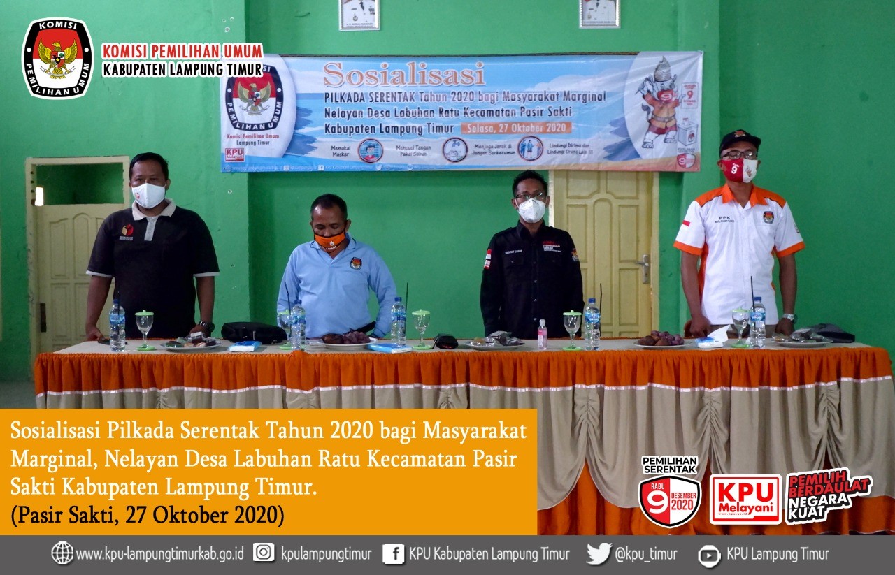 Lampung Timur, kab-lampungtimur.kpu.go.id - Sebagai upaya peningkatan Partisipasi Pemilihan Kepala Daerah Lampung Timur Tahun 2020, KPU Lampung Timur melangsungkan Sosialisasi kepada masyarakat marginal, dimana Nelayan di Desa Labuhan Ratu Kecamatan Pasir Sakti menjadi target KPU.(Selasa,27/10/2020)