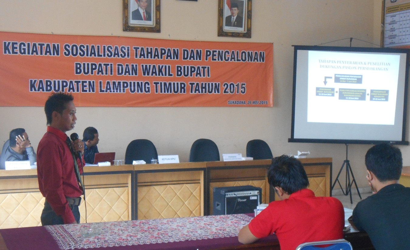 Komisi Pemilihan Umum Kabupaten Lampung Timur, hari ini (Selasa, 26/05/2015) melakukan kegiatan Sosisalisasi Tahapan dan Pencalonan Pemilihan Bupati dan Wakil Bupati Kabupaten Lampung Timur tahun 2015 di aula kantor KPU setempat.