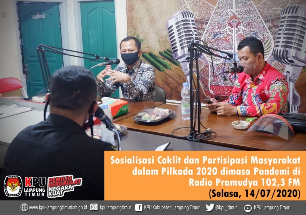 Komisi Pemilihan Umum (KPU) Kabupaten Lampung Timur terus menggaungkan semangat pemilihan Kepala Daerah 2020. Terbaru, penyelenggara pemilu melaksanakan talk show terkait “Coklit dan Partisipasi Masyarakat dalam Pilkada 2020 di Masa Pandemi” di radio Radio Pramudia Lestari 102.3 FM pada Selasa (14/07/2020) siang.