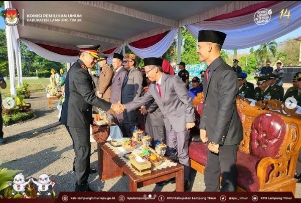 Sukadana, kab-lampungtimur.kpu.go.id – Ketua KPU Kabupaten Lampung Timur Wasiyat Jarwo Asmoro mengikuti Upacara Peringatan Hari Bhayangkara ke-77, Sabtu (01/07). Upacara yang dilaksanakan di Halaman Kantor Pemda Lampung Timur tersebut dimulai pada pukul 07.30 WIB, upacara dipimpin oleh Kapolres Lampung Timur, AKBP M Rizal Muchtar yang bertindak sebagai Inspektur Upacara. Giat diikuti oleh seluruh Forkopimda, Ketua KPU, Bawaslu, Pengadilan Negeri, Pengadilan Agama, Sekretaris Daerah, dan Kepala Organisasi Perangkat Daerah (OPD). Peringatan hari Bhayangkara ke-77 pada tahun 2023 ini mengambil tema "Polri Presisi Untuk Negeri, Pemilu Damai Menuju Indonesia Emas".