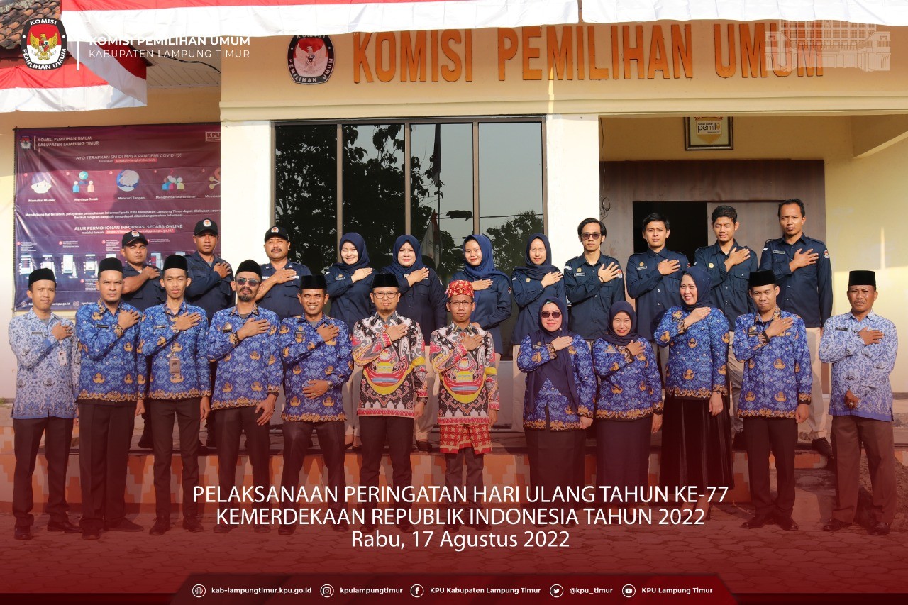 Upacara dilaksanakan di halaman kantor KPU Kabupaten Lampung Timur. Bertindak sebagai Pembina Upacara Ketua KPU Kabupaten Lampung Timur, Wasiyat Jarwo Asmoro. Dalam amanatnya beliau berpesan bahwa di tahun tahun sebelumnya telah terjadi pandemi covid 19 namun ditengah keterpurukan tersebut beliau menyampaikan harapan agar semua yang terdampak dapat bangkit dari peristiwa yang terjadi selama dua tahun tersebut. Selain itu beliau juga menambahkan agar semua elemen bangsa dapat bergerak bersama dan bergotong royong untuk mewujudkan harapan baru sesuai dengan tema kemerdekaan indonesia ke- 77 yaitu "pulih lebuh cepat bangkit lebih kuat.